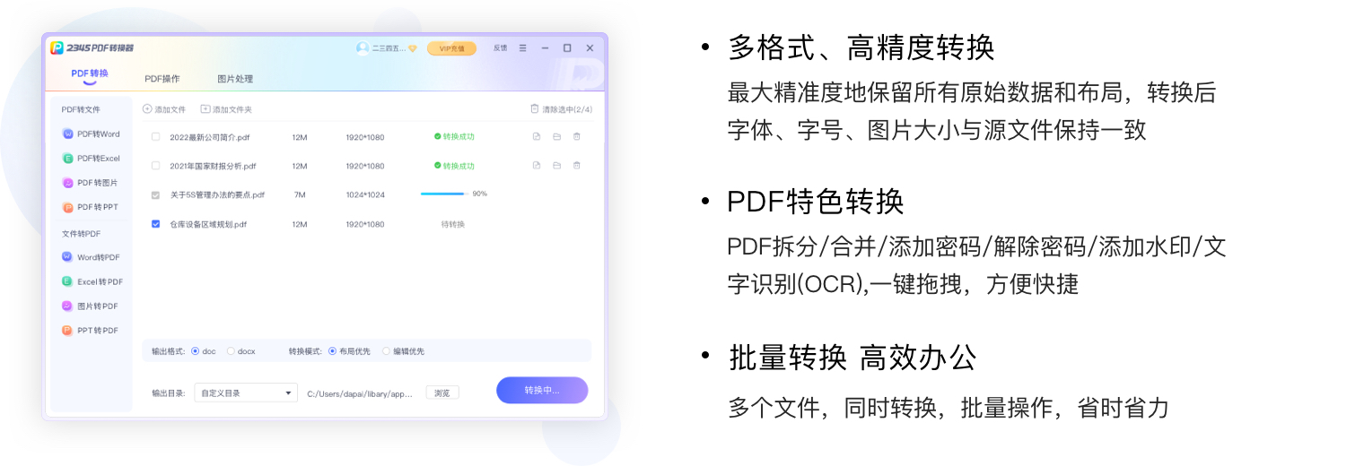 輕巧、方便、快捷、安全2345PDF轉(zhuǎn)換器,是一款功能強大、操作簡單的PDF轉(zhuǎn)換軟件,支持PDF文檔和Word、PPT、Excel、圖片等文檔多種格式之間的互轉(zhuǎn);同時支持PDF拆分、PDF合并、PDF添加和解除密碼、圖片處理以及OCR文字識別等功能。文件轉(zhuǎn)換格式豐富、轉(zhuǎn)換質(zhì)量好、產(chǎn)品界面操作便捷,是新一代文件格式轉(zhuǎn)換工具。 了解更多