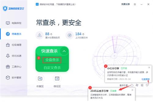 第二步:開啟云查殺引擎,更新小紅傘引擎,并進行全盤殺毒