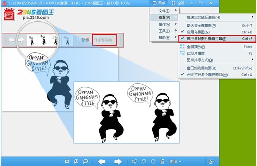首先,獨有的多幀圖片查看工具支持GIF等多幀圖片的播放與單幀保存。最近十分流行鳥叔的江南STYLE騎馬舞步,用2345看圖王可以快速瀏覽學習每一個動作,讓自己時刻處于時尚潮流的前端。
